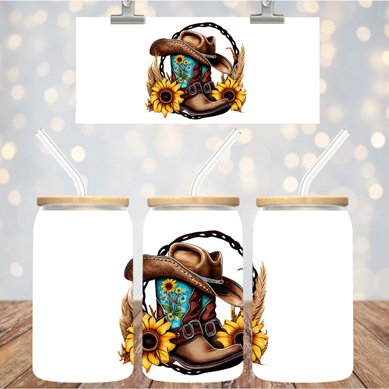 4" Decal Uvdtf Wrap Western Cowboy Boots Sunflowers D210