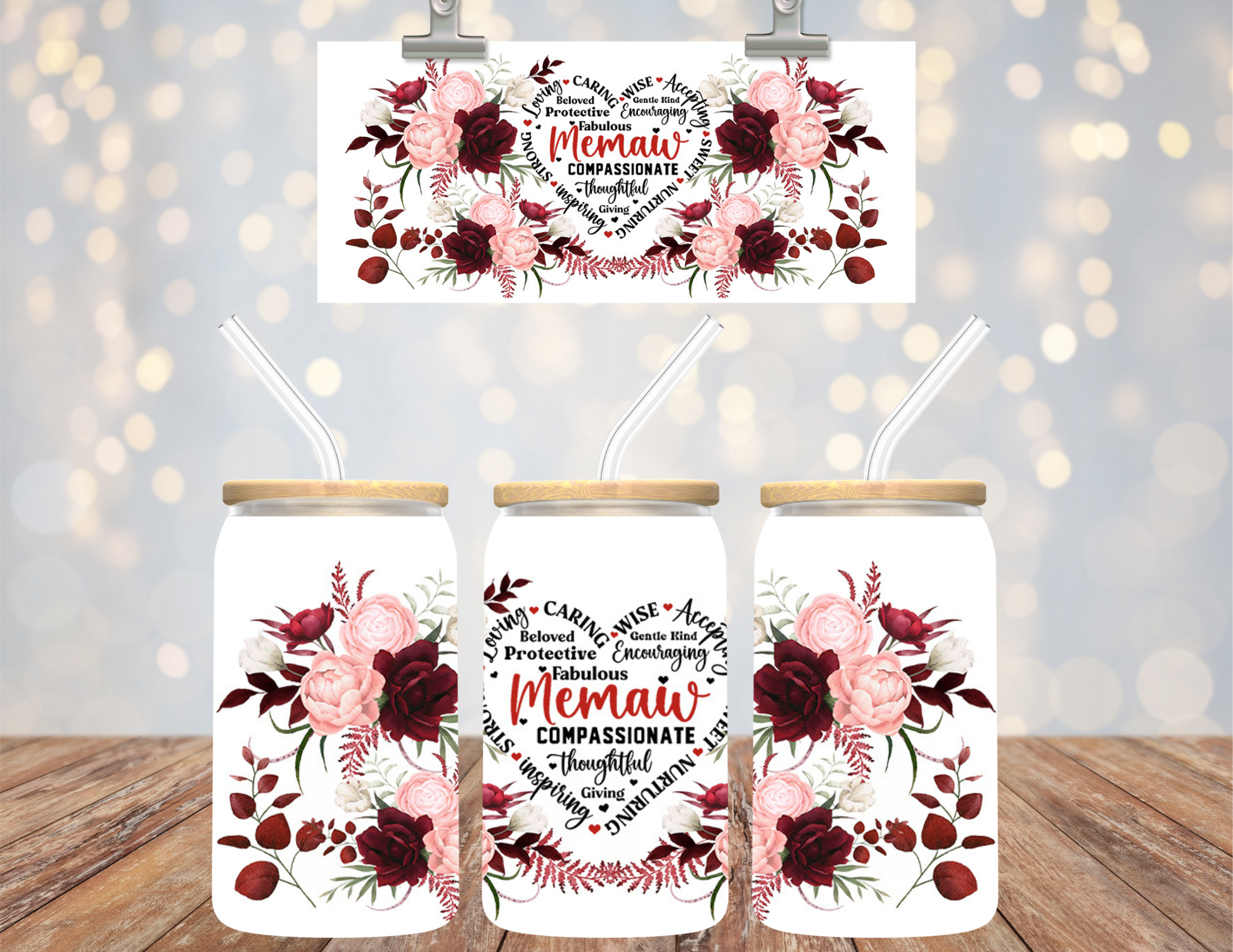 Uv Dtf Wrap Memaw loving, caring, wise, accepting, sweet, nurturing, strong, inspiring, beloved, protective, fabulous, gentle, kind, encouraging
